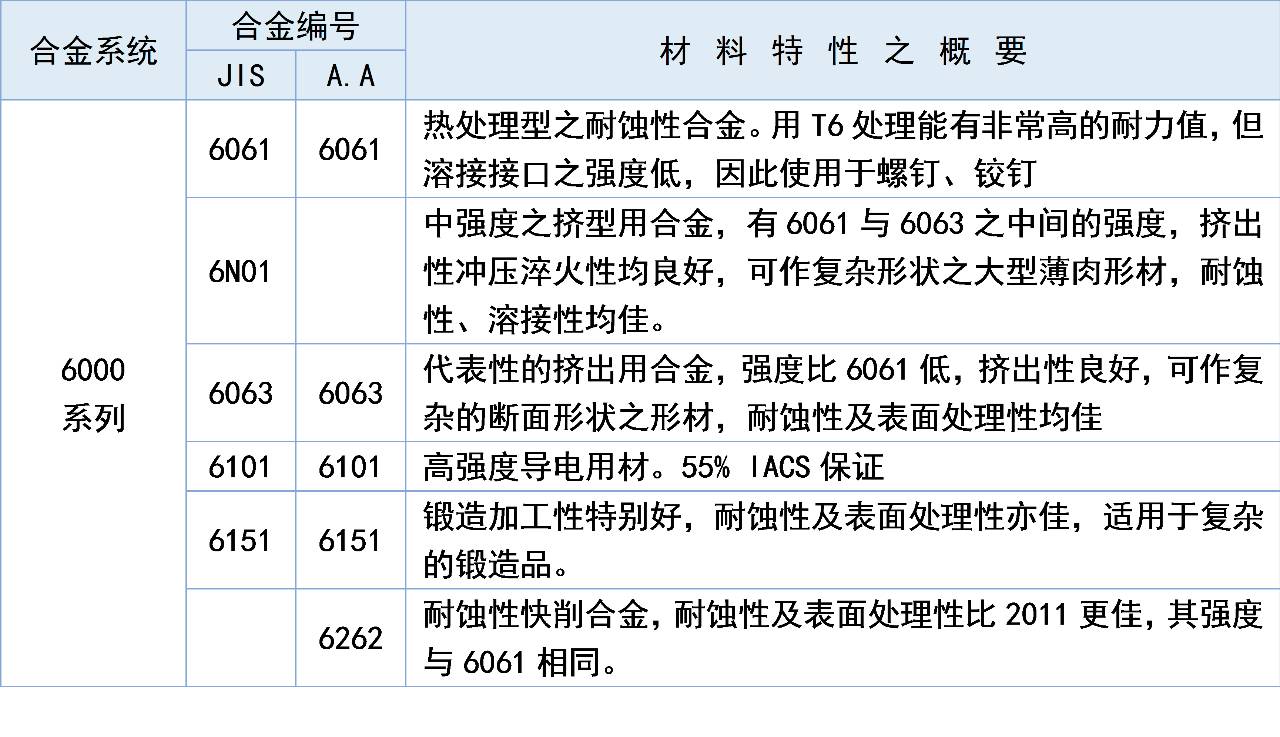 6000系列鋁合金代表6061 主要含有鎂和硅兩種元素,故集中了4000系列和5000系列的優點6061是一種冷處理鋁鍛造產品,適用于對抗腐蝕性、氧化性要求高的應用。可使用性好,容易涂層,加工性好。而6063則是門窗行業人zui熟悉的,因為門窗型材基本上是6063牌號鋁合金